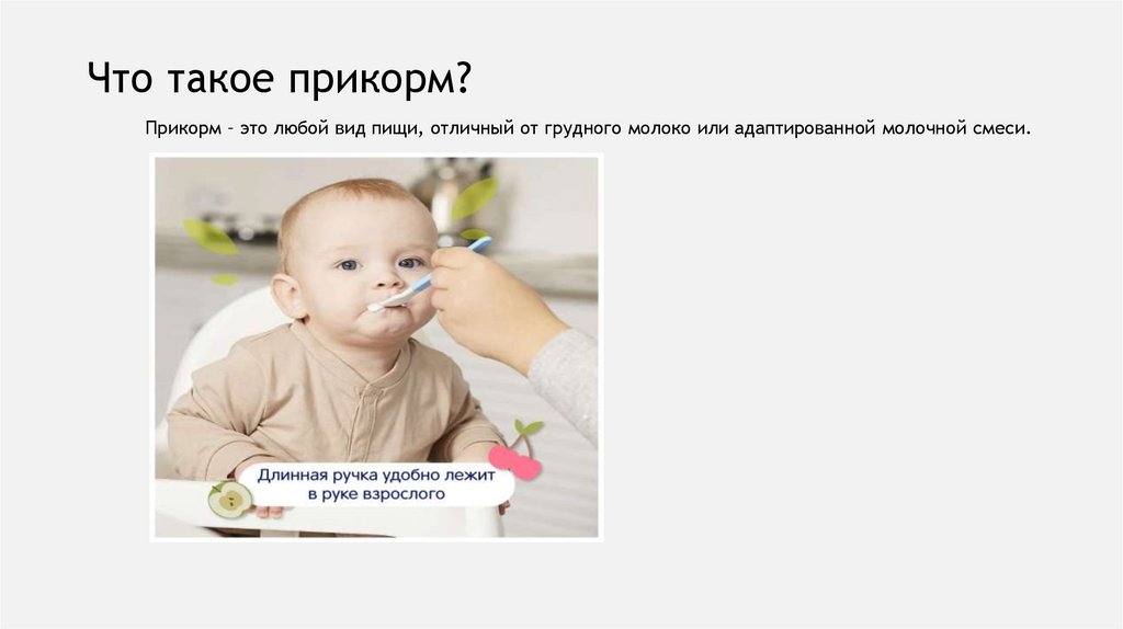 Что такое прикорм?Прикорм – это любой вид пищи, отличный от грудного молоко или адаптированной молочной смеси.