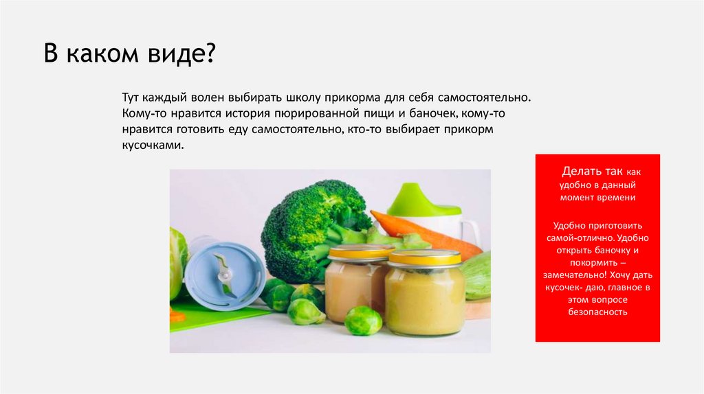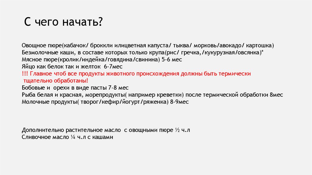 С чего начать?Овощное пюре(кабачок/ броккли илицветная капуста/ тыква/ морковь/авокадо/ картошка)