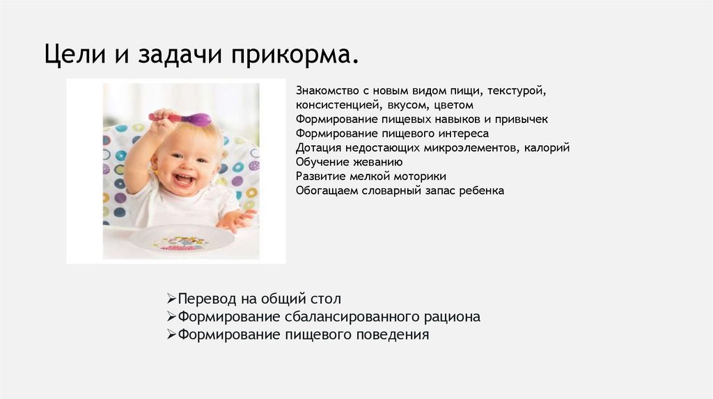 Цели и задачи прикорма.Знакомство с новым видом пищи, текстурой,