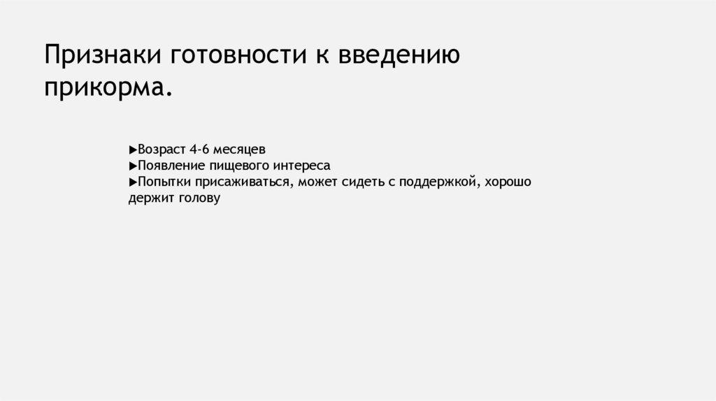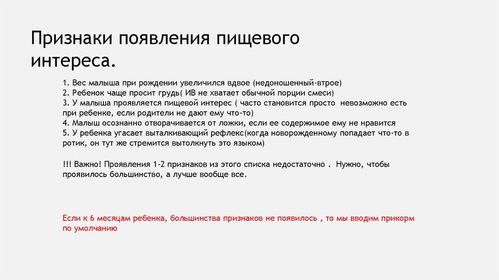 Если к 6 месяцам ребенка, большинства признаков не появилось , то мы вводим прикорм