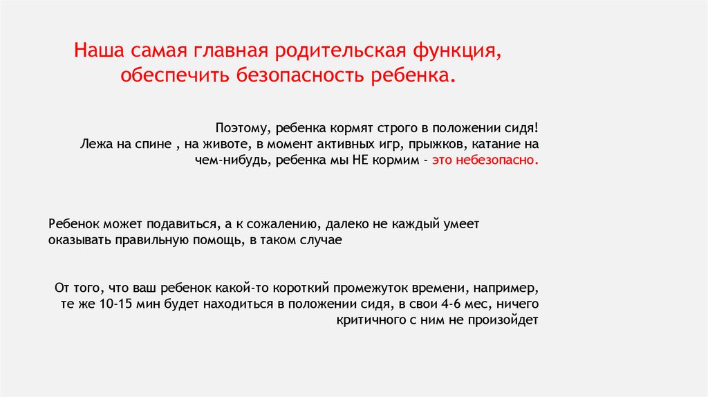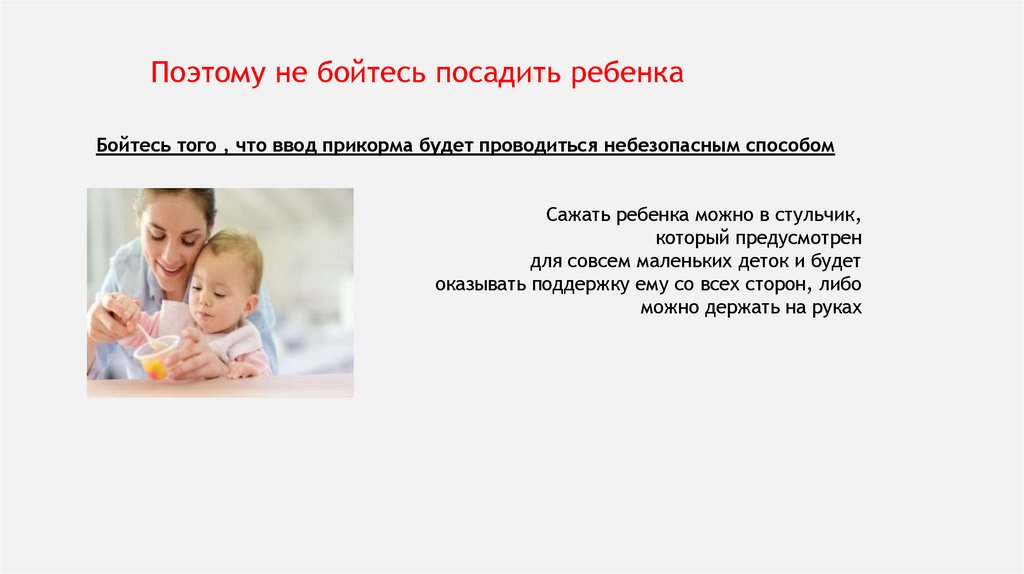 Поэтому не бойтесь посадить ребенкаБойтесь того , что ввод прикорма будет проводиться небезопасным способом