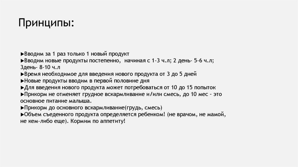 Принципы:Вводим за 1 раз только 1 новый продукт