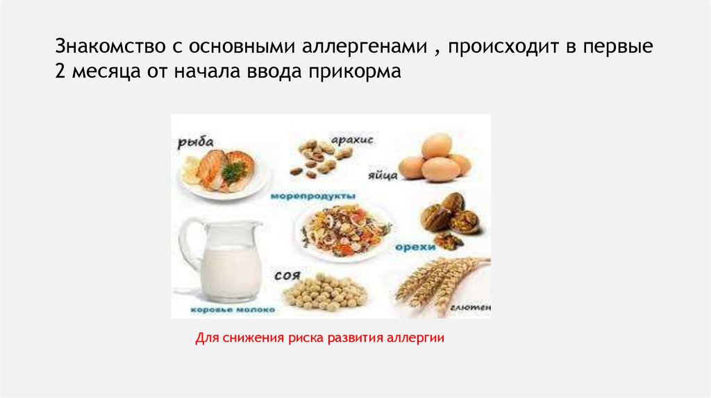 Знакомство с основными аллергенами , происходит в первые2 месяца от начала ввода прикорма
