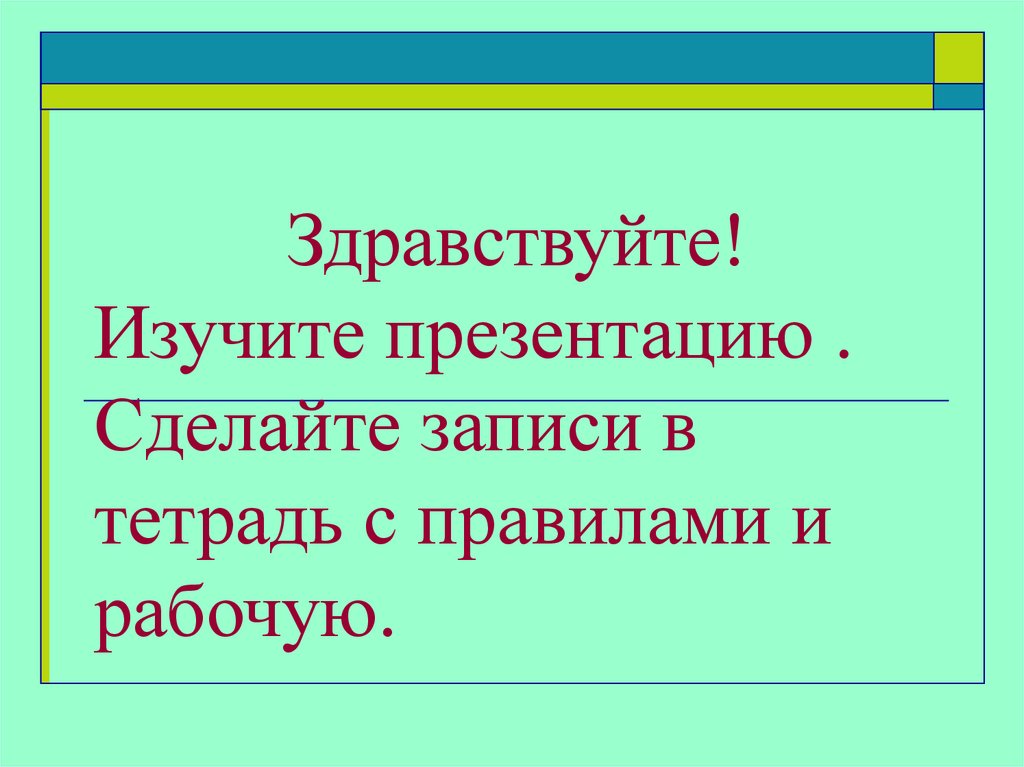 1. Здравствуйте! Изучите презентацию . Сделайте записи в тетрадь с правилами и рабочую.