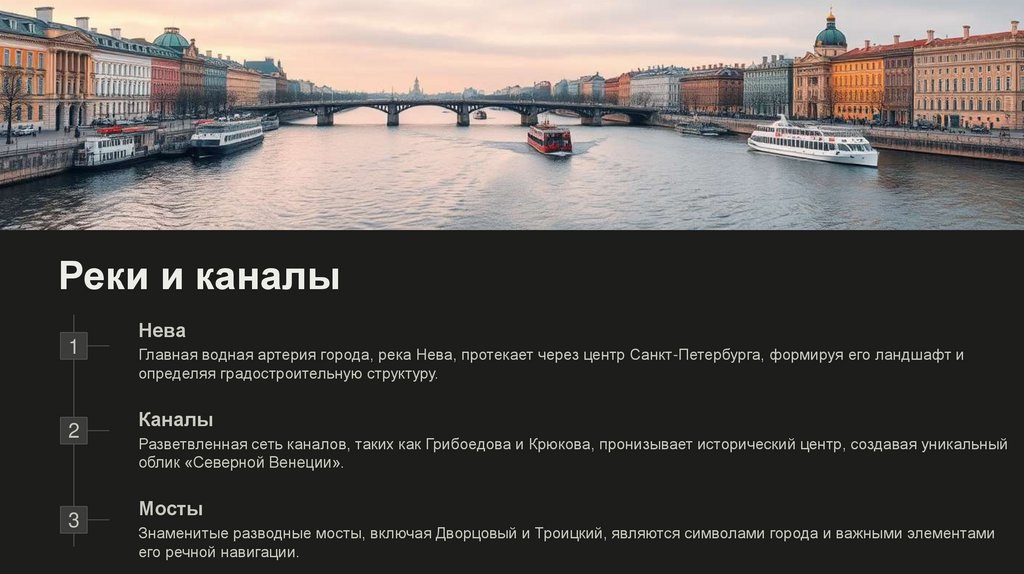 Знаменитые разводные мосты, включая Дворцовый и Троицкий, являются символами города и важными элементами