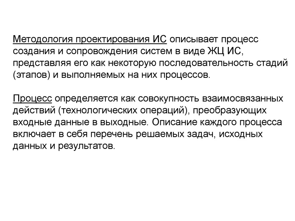 Методология проектирования ИС описывает процесссоздания и сопровождения систем в виде ЖЦ ИС,