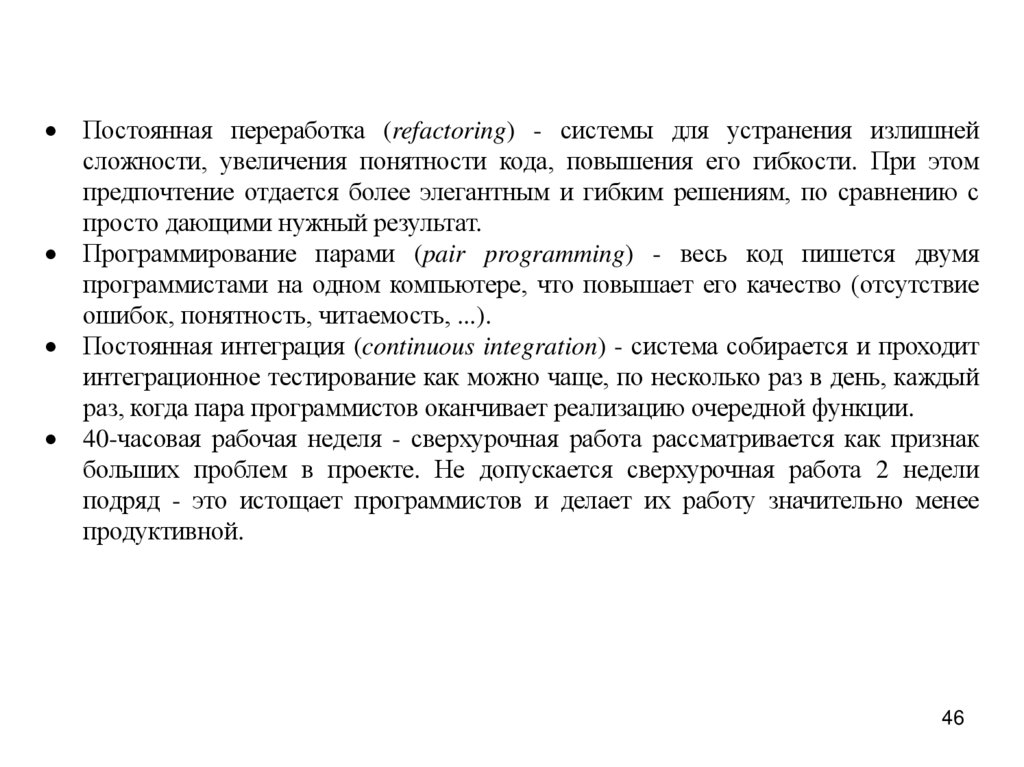 Постоянная переработка (refactoring) - системы для устранения излишнейсложности, увеличения понятности кода, повышения его гибкости. При этом
