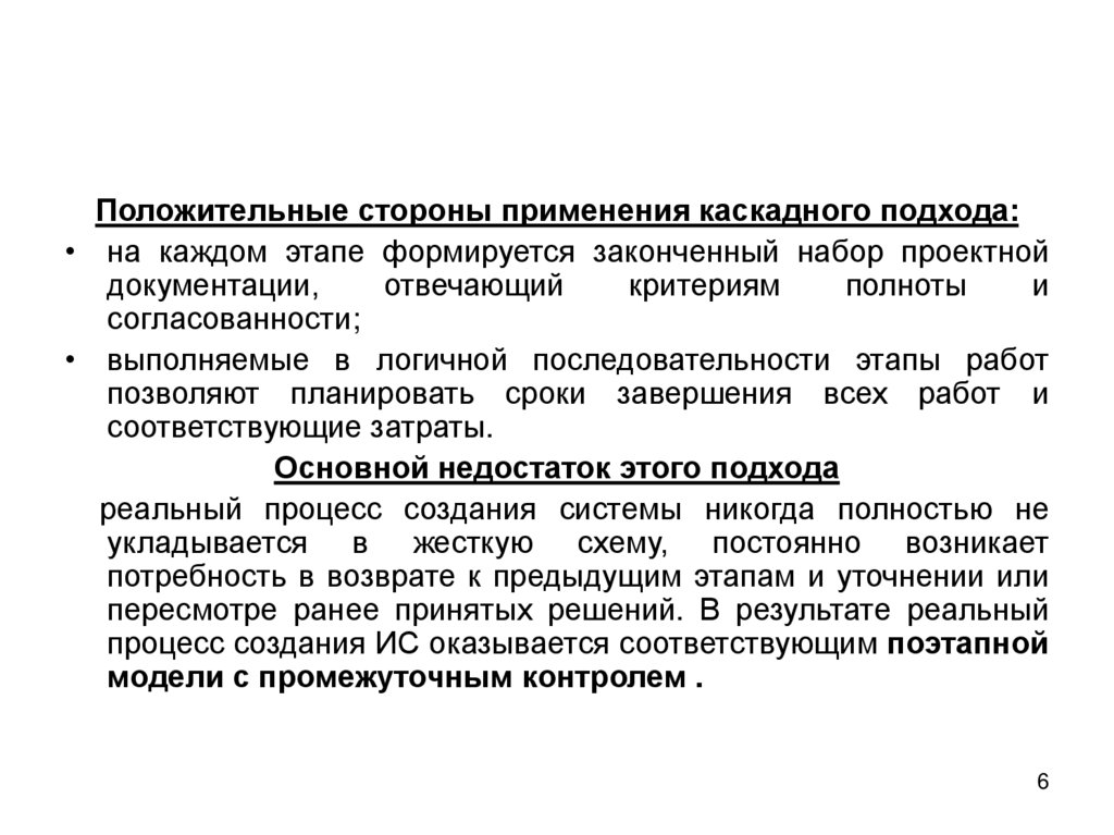Положительные стороны применения каскадного подхода:• на каждом этапе формируется законченный набор проектной
