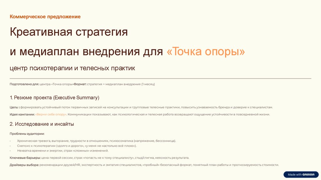 Подготовлено для: центра «Точка опоры»Формат: стратегия + медиаплан внедрения (1 месяц)