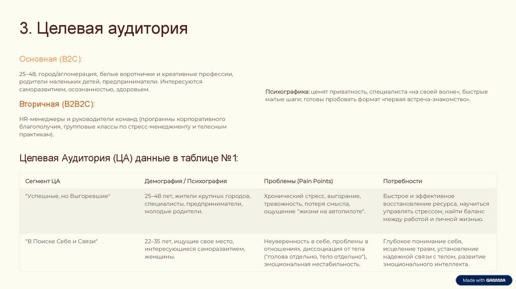 Целевая Аудитория (ЦА) данные в таблице №1: