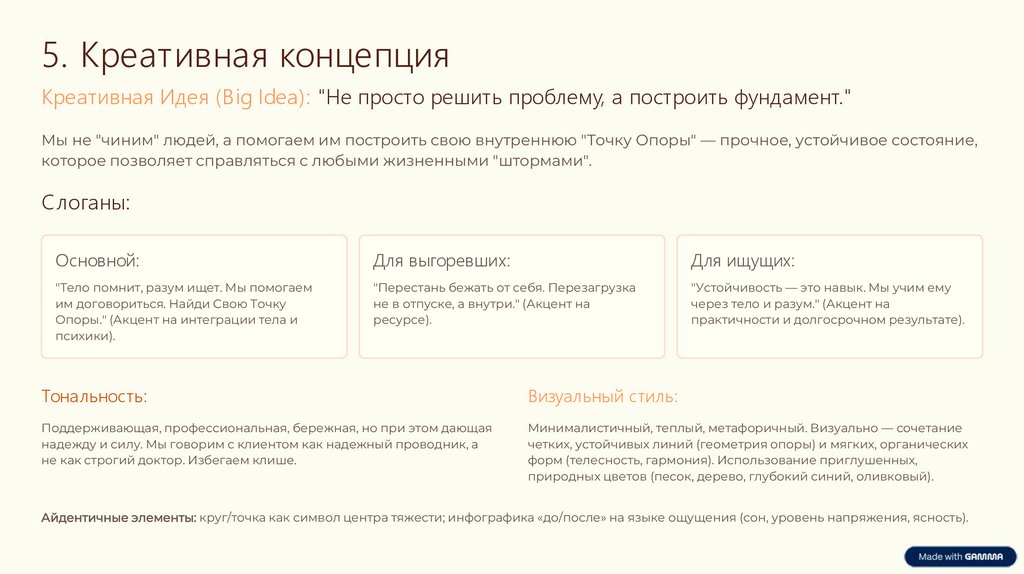 5. Креативная концепцияКреативная Идея (Big Idea): "Не просто решить проблему, а построить фундамент."