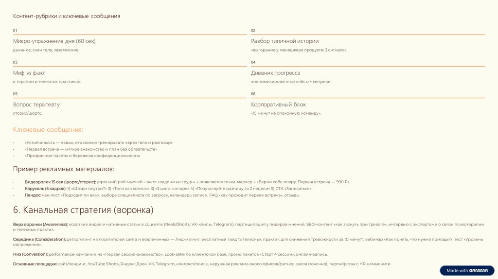 Видеоролики 15–30 сек («Шторм — Опора», «3 сигнала выгорания», «Тело помнит»).