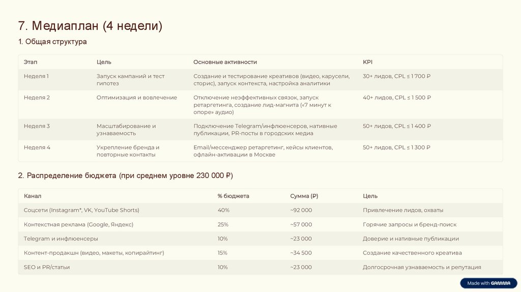 Фокус на performance-каналах (VK, Instagram*/Reels, YouTube Shorts) с частотой 3–4 показа/7 дней.