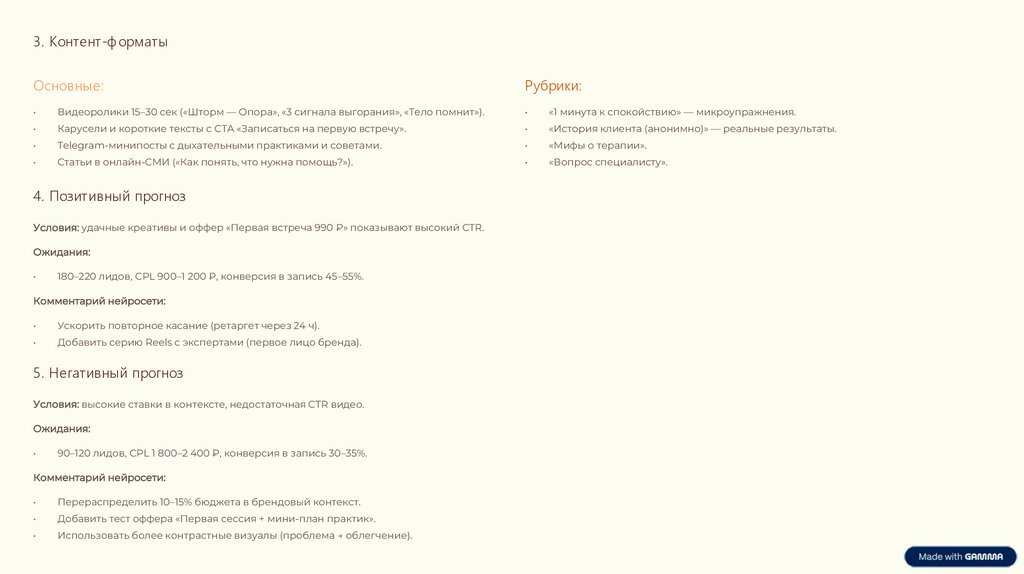 A/B-тесты: хук («шторм/тишина»), оффер (первая встреча vs диагностика), формат (шорт/карусель), лендинг (герой-экран).