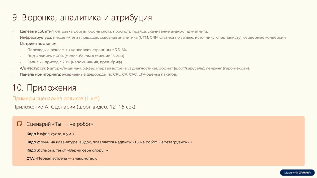 9. Воронка, аналитика и атрибуцияЦелевые события: отправка формы, бронь слота, просмотр прайса, скачивание аудио-лид-магнита.
