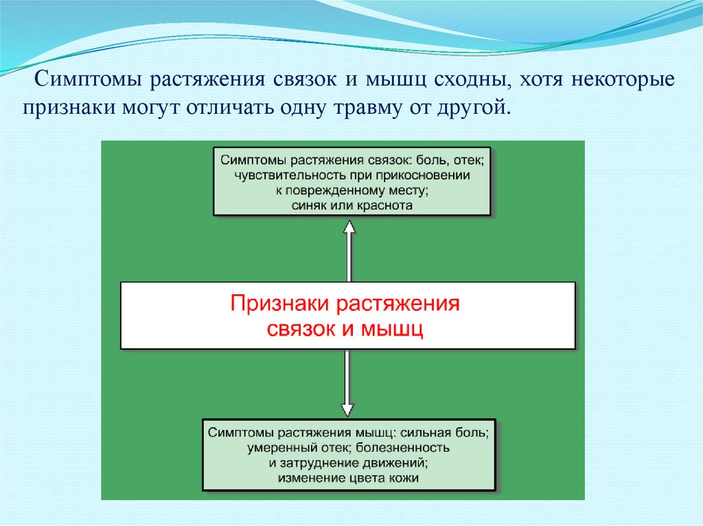 Симптомы растяжения связок и мышц сходны, хотя некоторыепризнаки могут отличать одну травму от другой.
