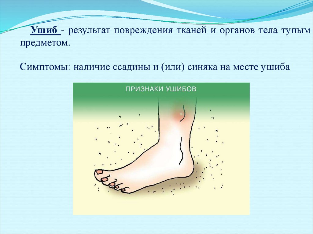 Симптомы: наличие ссадины и (или) синяка на месте ушиба