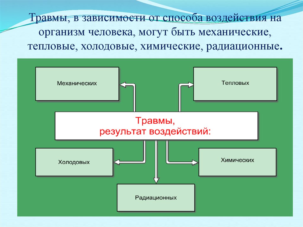 Травмы, в зависимости от способа воздействия наорганизм человека, могут быть механические,