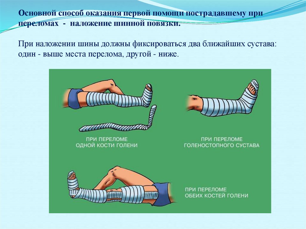 Основной способ оказания первой помощи пострадавшему припереломах - наложение шинной повязки.