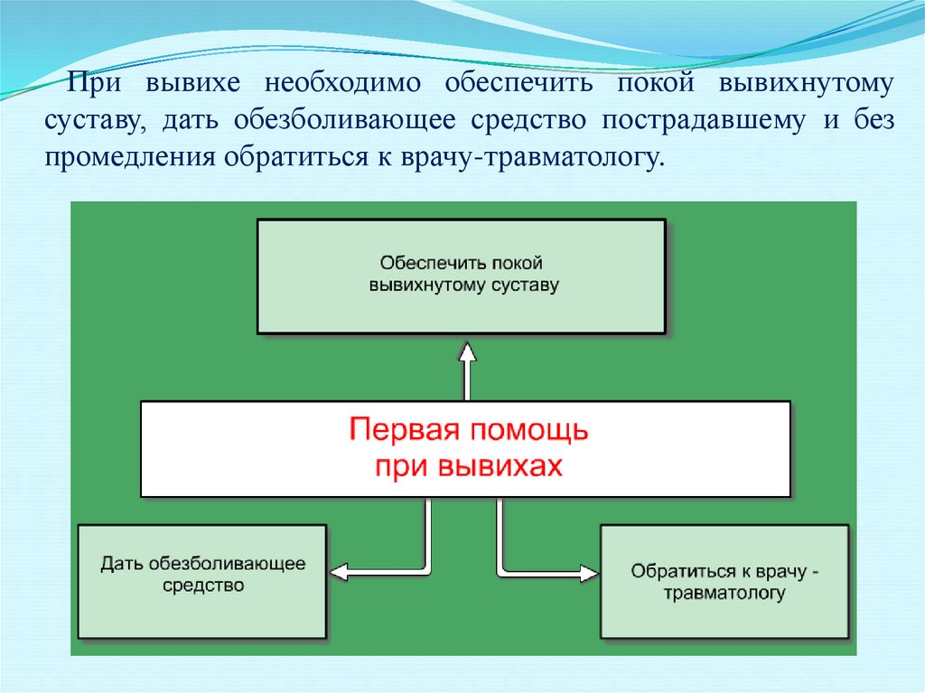 При вывихе необходимо обеспечить покой вывихнутомусуставу, дать обезболивающее средство пострадавшему и без