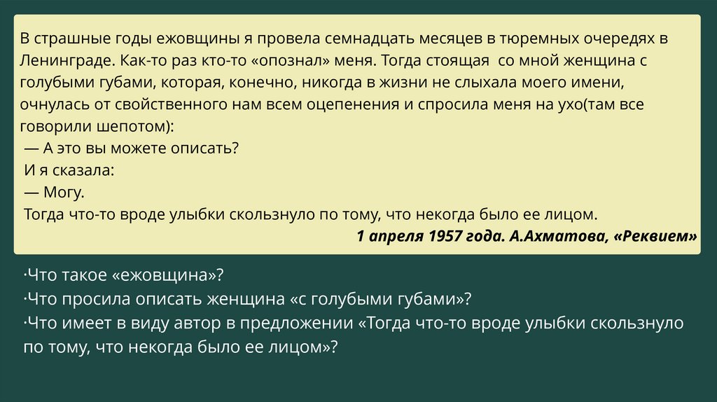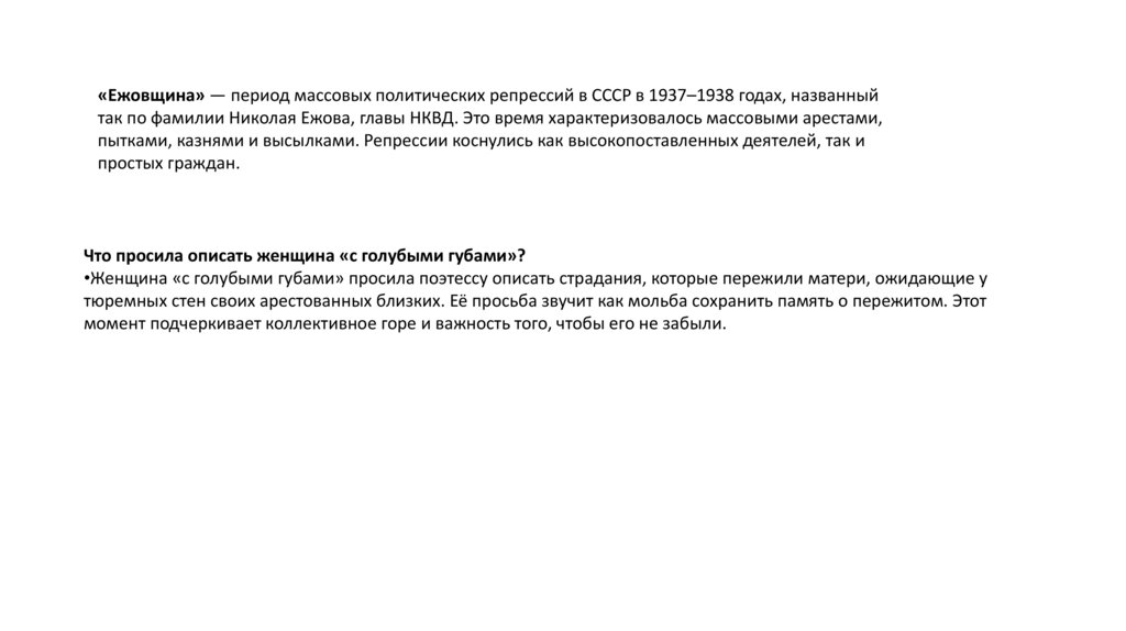 •Женщина «с голубыми губами» просила поэтессу описать страдания, которые пережили матери, ожидающие у