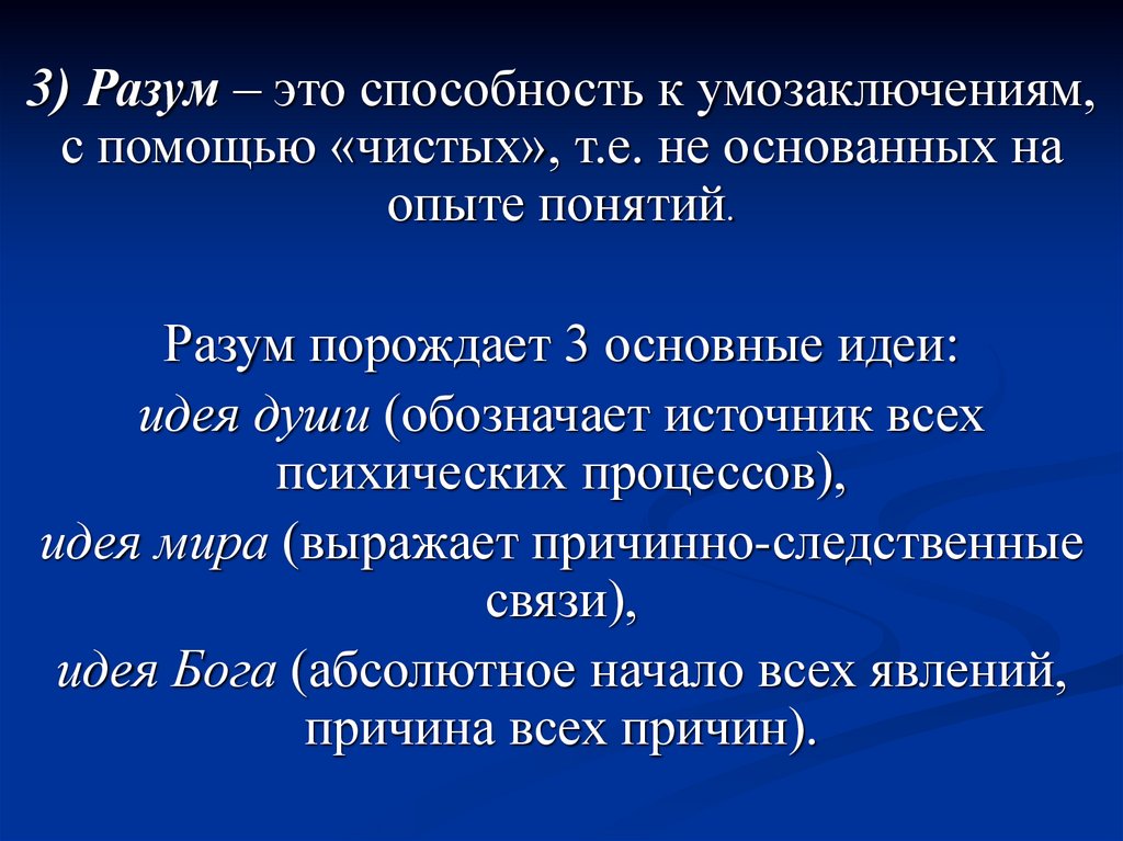 3) Разум – это способность к умозаключениям,с помощью «чистых», т.е. не основанных на