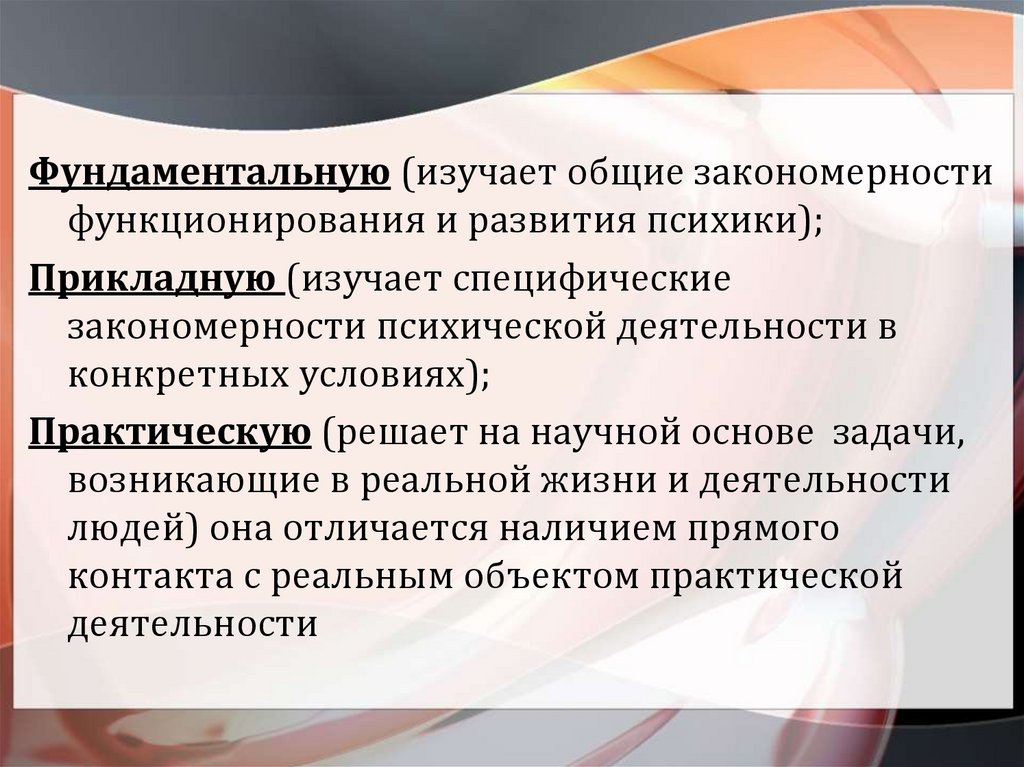 Фундаментальную (изучает общие закономерностифункционирования и развития психики);