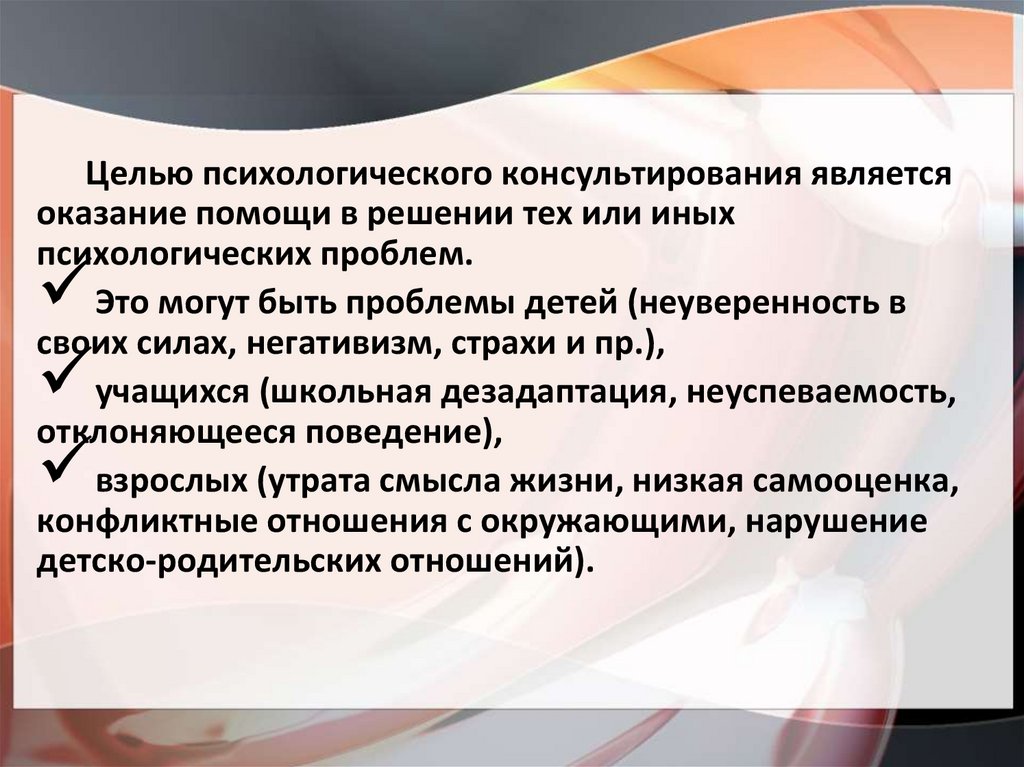 Целью психологического консультирования являетсяоказание помощи в решении тех или иных