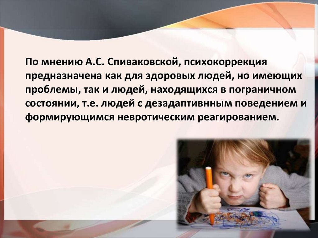 По мнению А.С. Спиваковской, психокоррекцияпредназначена как для здоровых людей, но имеющих