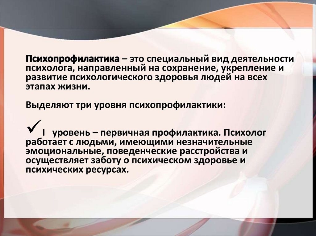 – это специальный вид деятельностипсихолога, направленный на сохранение, укрепление и