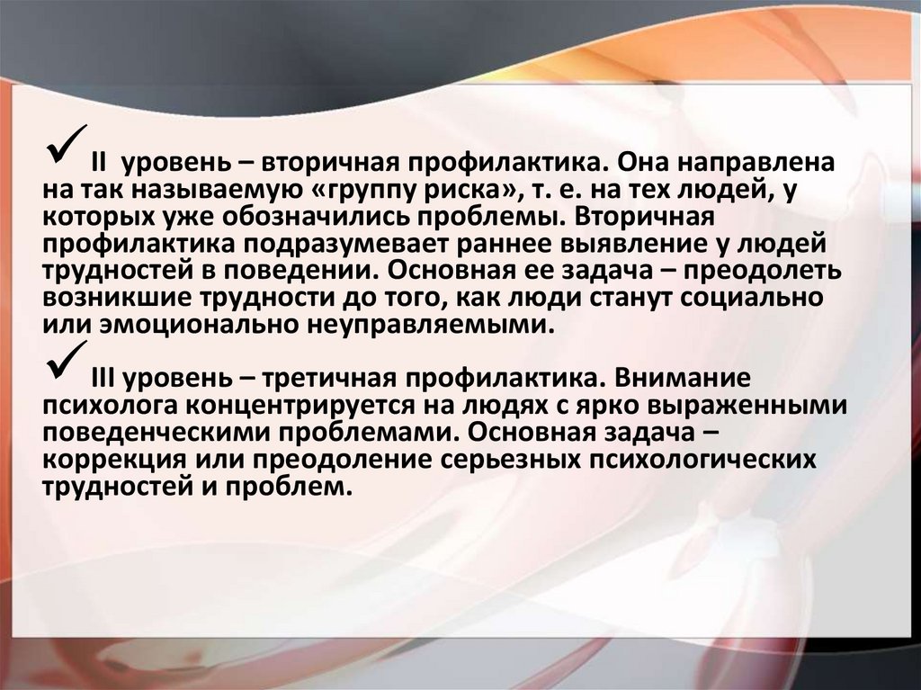 II уровень – вторичная профилактика. Она направленана так называемую «группу риска», т. е. на тех людей, у