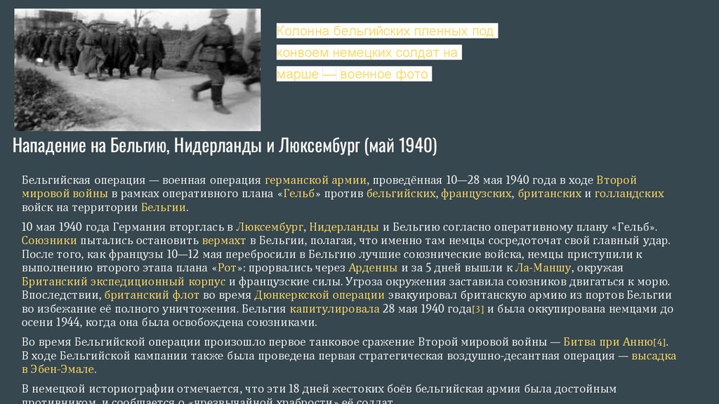 во избежание её полного уничтожения. Бельгия капитулировала 28 мая 1940 года[3] и была оккупирована немцами до