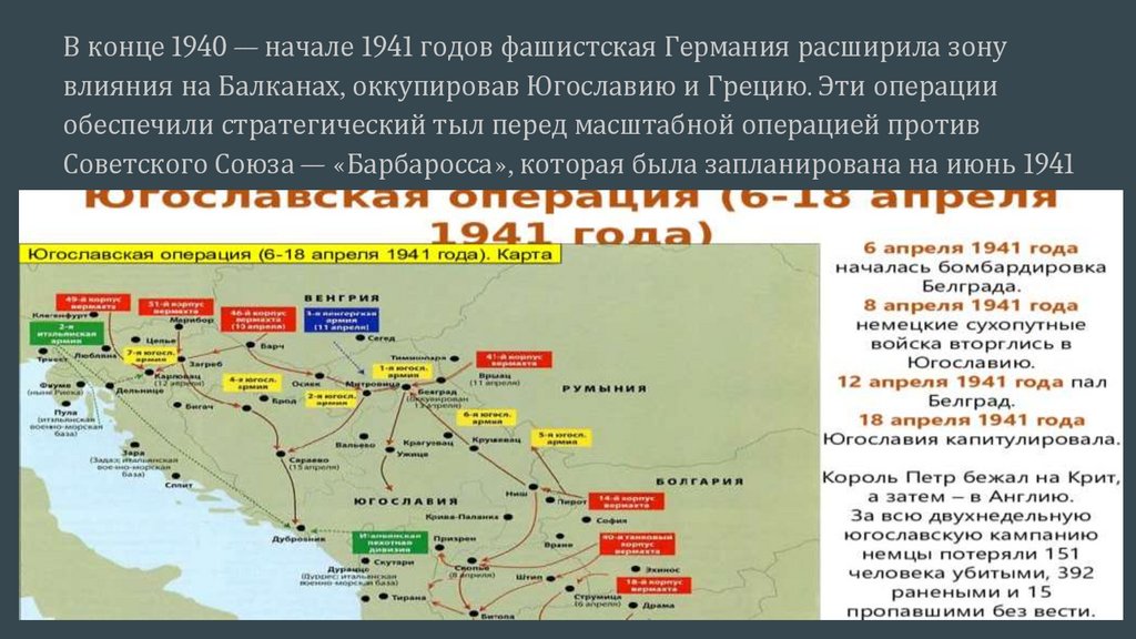 В конце 1940 — начале 1941 годов фашистская Германия расширила зонувлияния на Балканах, оккупировав Югославию и Грецию. Эти операции