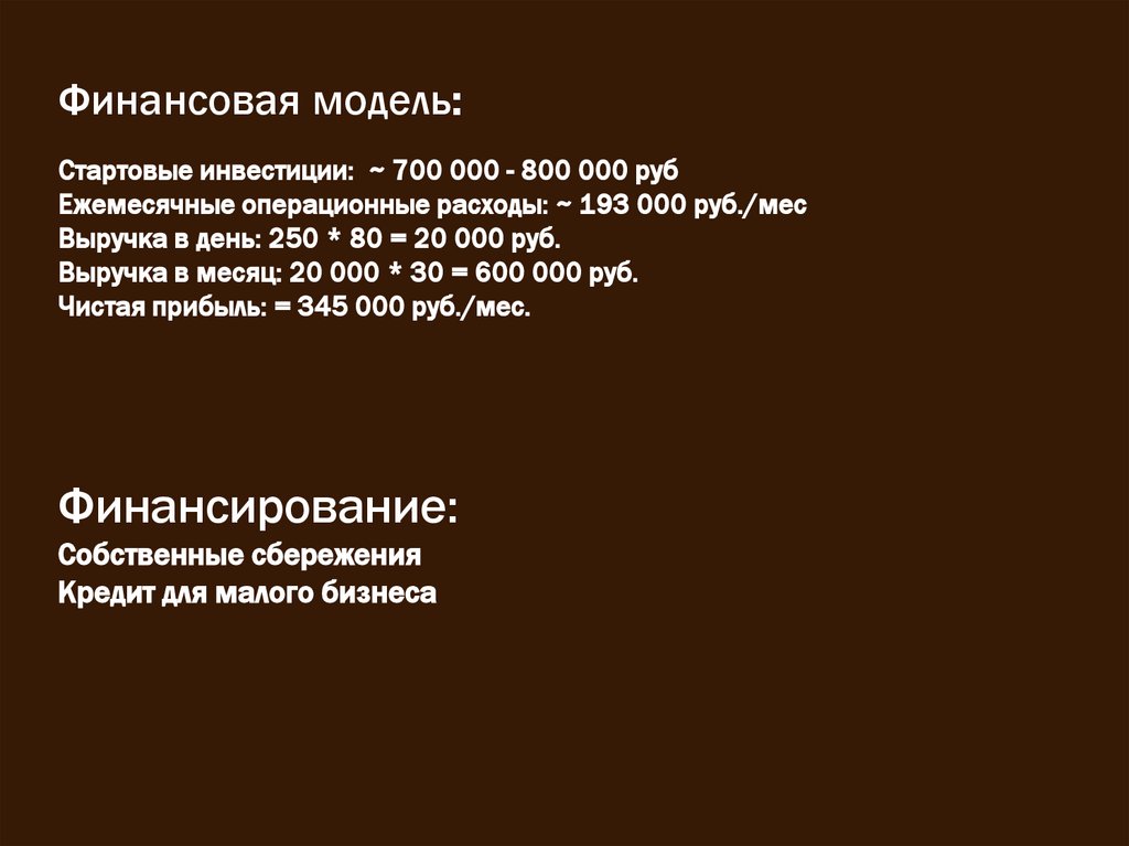 Финансовая модель:Стартовые инвестиции: ~ 700 000 - 800 000 руб