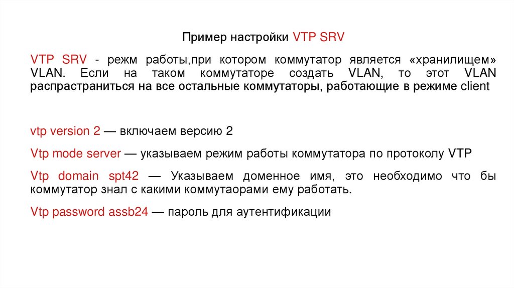 Пример настройки VTP SRVVTP SRV - режм работы,при котором коммутатор является «хранилищем»
