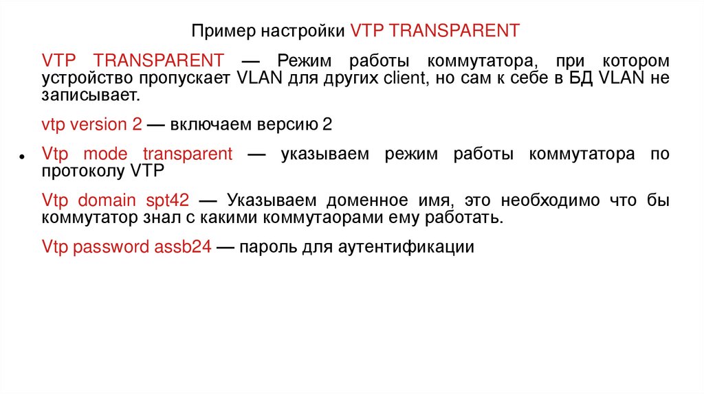 Пример настройки VTP TRANSPARENTVTP TRANSPARENT — Режим работы коммутатора, при котором