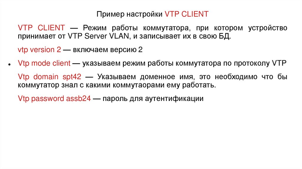 Пример настройки VTP CLIENTVTP CLIENT — Режим работы коммутатора, при котором устройство