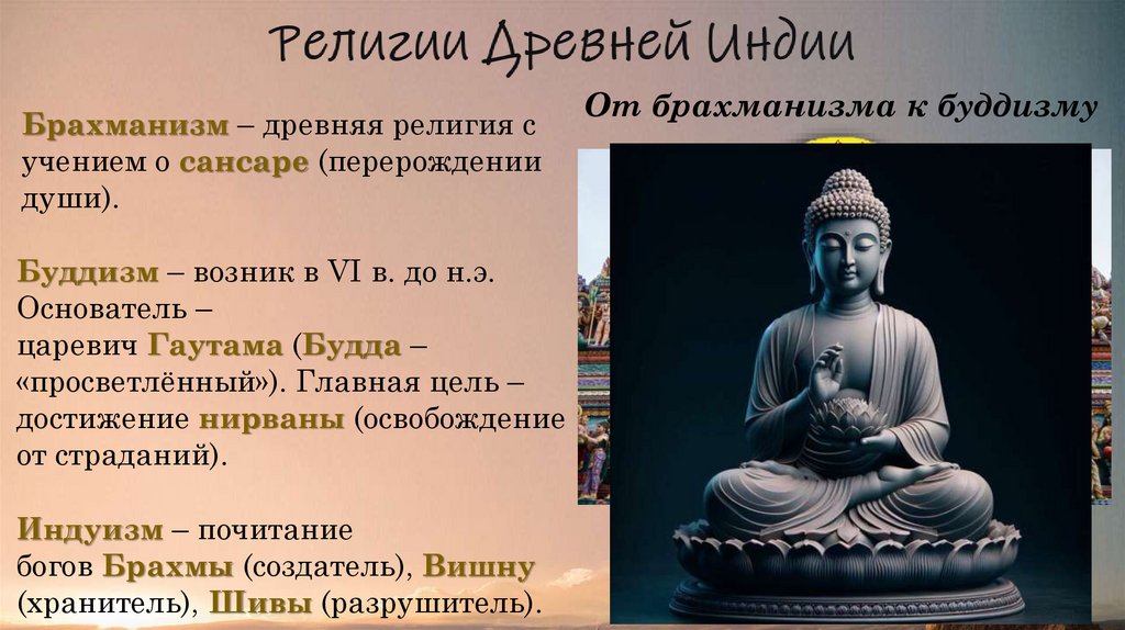 Религии Древней Индии: брахманизм,индуизм, буддизм.