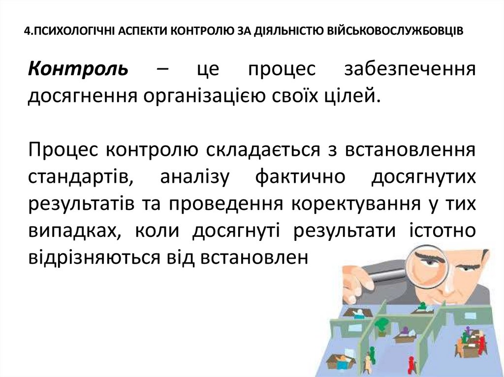 4.ПСИХОЛОГІЧНІ АСПЕКТИ КОНТРОЛЮ ЗА ДІЯЛЬНІСТЮ ВІЙСЬКОВОСЛУЖБОВЦІВКонтроль – це процес забезпечення