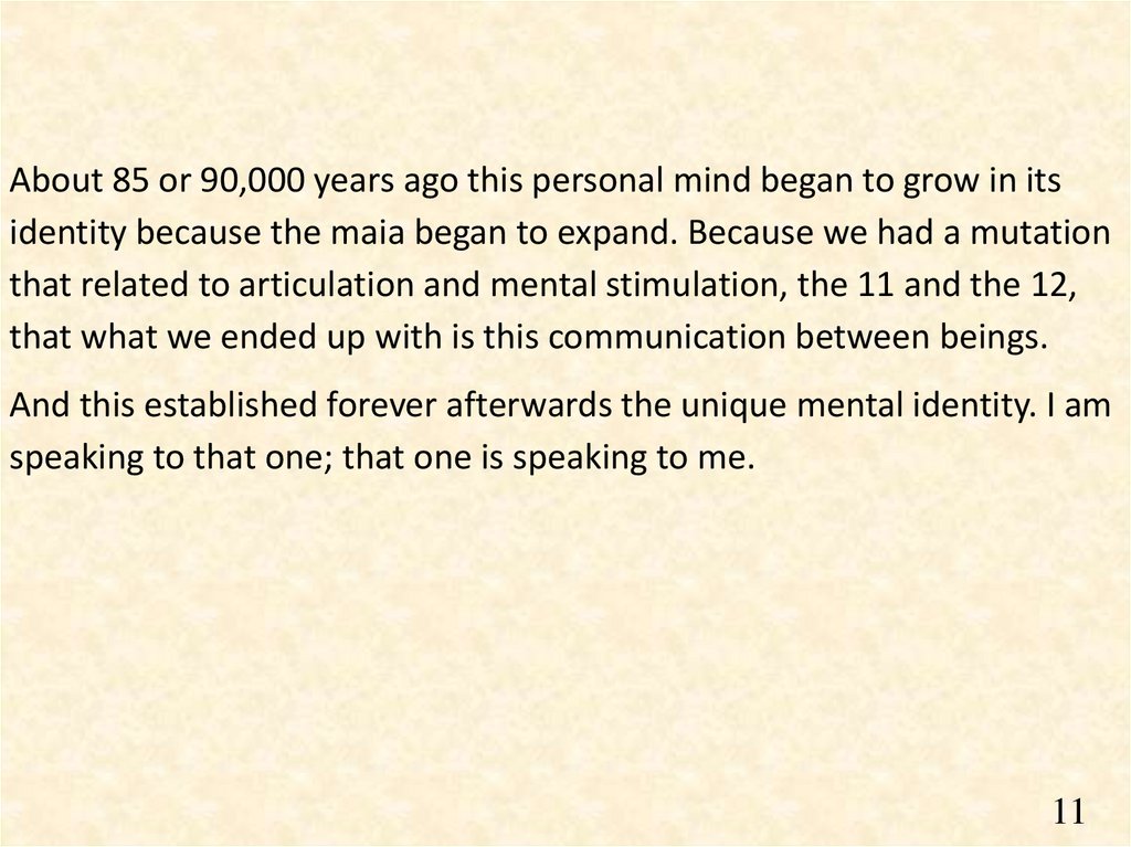 About 85 or 90,000 years ago this personal mind began to grow in itsidentity because the maia began to expand. Because we had a mutation
