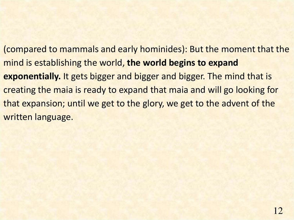 (compared to mammals and early hominides): But the moment that themind is establishing the world, the world begins to expand