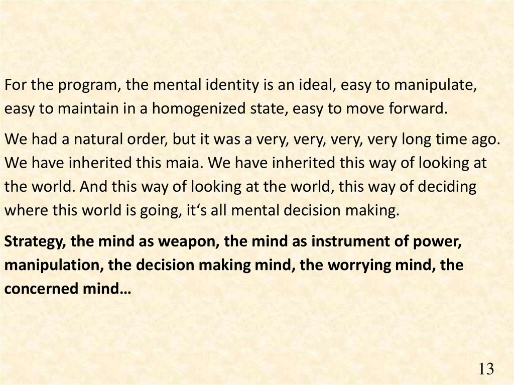 For the program, the mental identity is an ideal, easy to manipulate,easy to maintain in a homogenized state, easy to move forward.