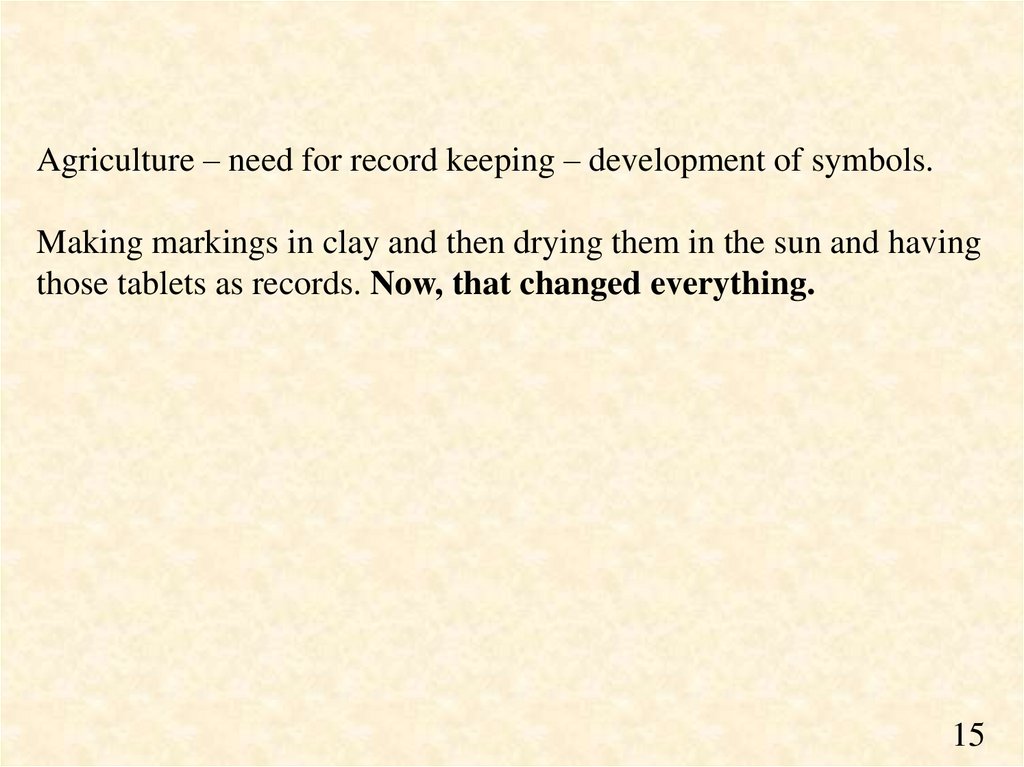 Agriculture – need for record keeping – development of symbols.Making markings in clay and then drying them in the sun and having