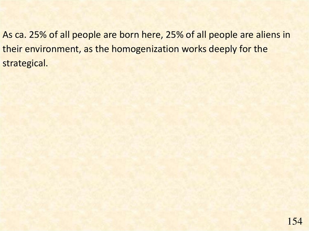As ca. 25% of all people are born here, 25% of all people are aliens intheir environment, as the homogenization works deeply for the