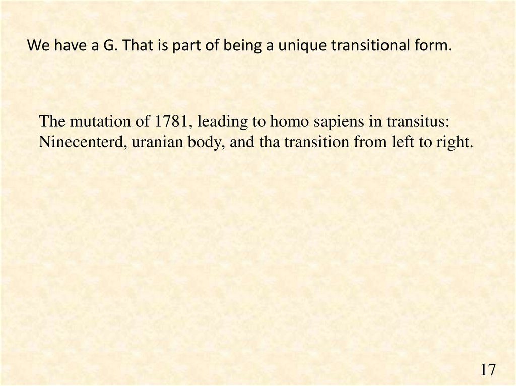 We have a G. That is part of being a unique transitional form.The mutation of 1781, leading to homo sapiens in transitus: