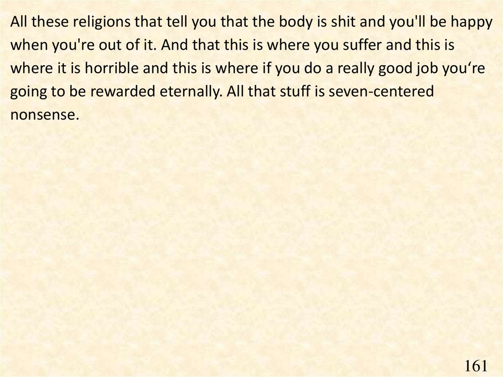 All these religions that tell you that the body is shit and you'll be happywhen you're out of it. And that this is where you suffer and this is