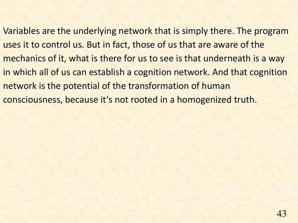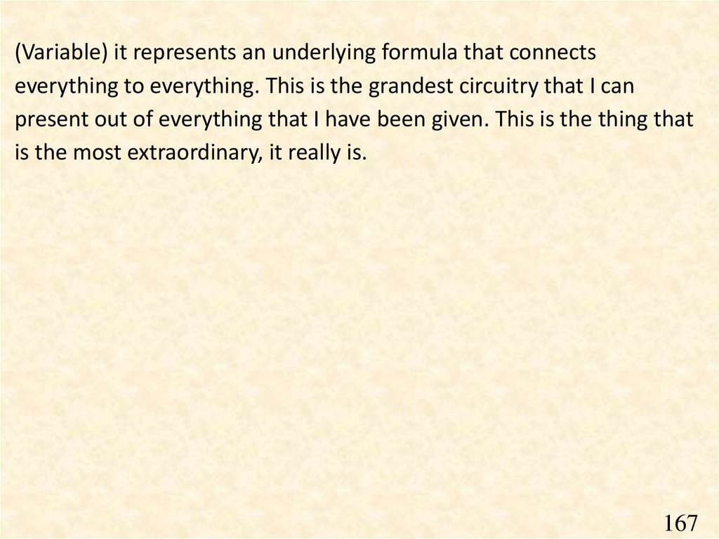 (Variable) it represents an underlying formula that connectseverything to everything. This is the grandest circuitry that I can