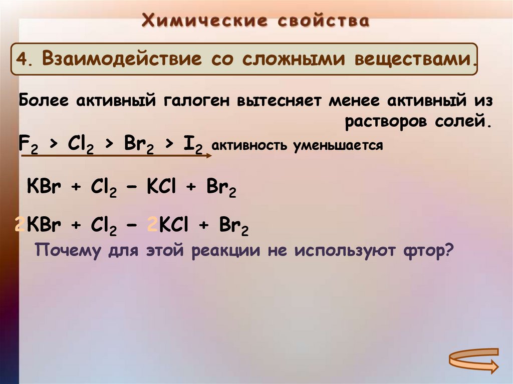 4. Взаимодействие со сложными веществами.Более активный галоген вытесняет менее активный из