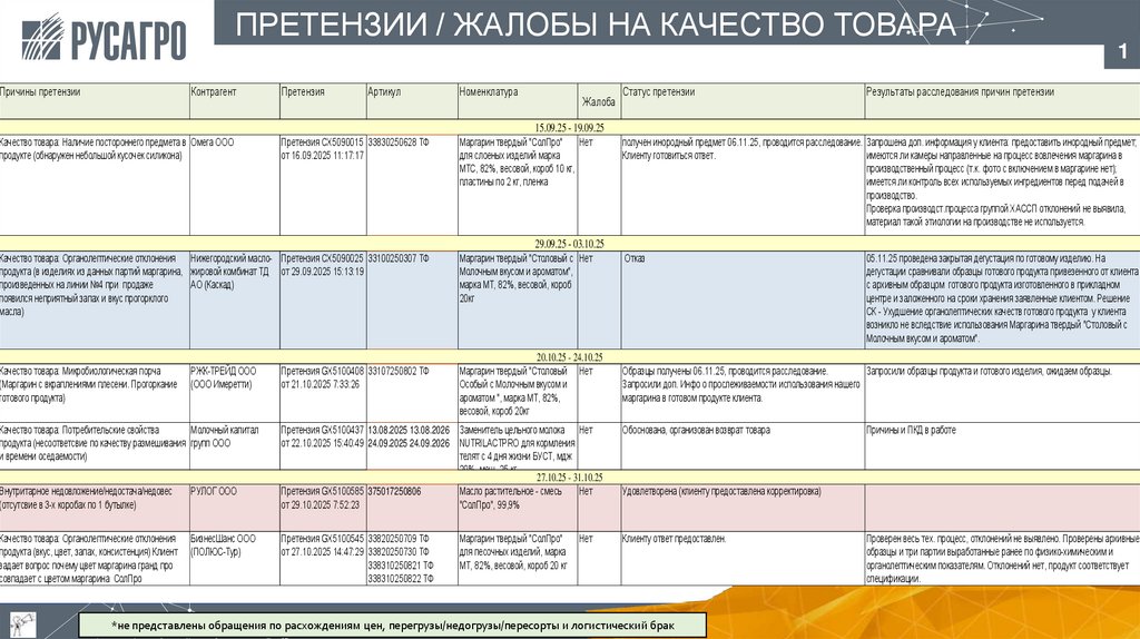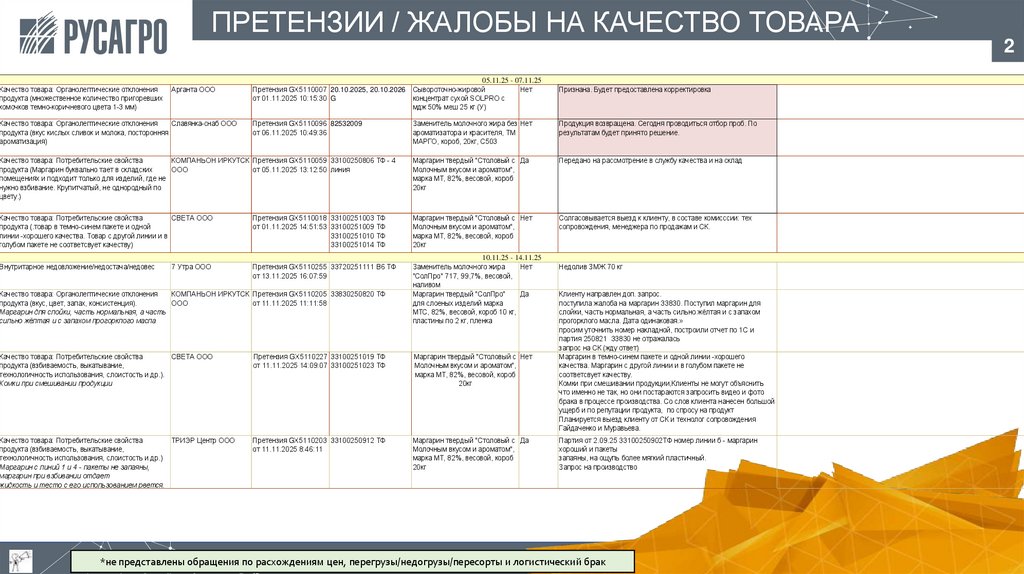 *не представлены обращения по расхождениям цен, перегрузы/недогрузы/пересорты и логистический брак