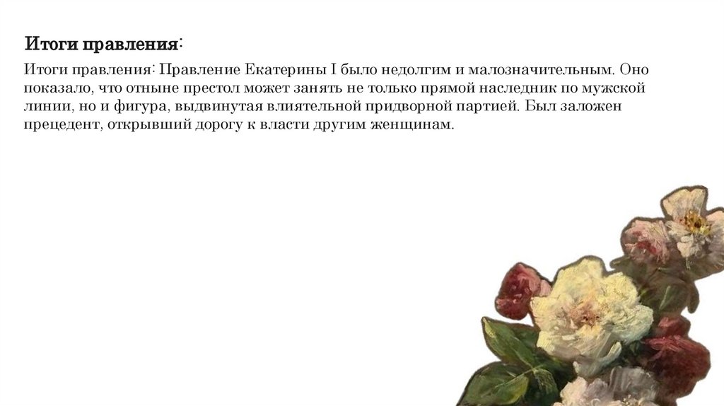 Итоги правления:Итоги правления: Правление Екатерины I было недолгим и малозначительным. Оно